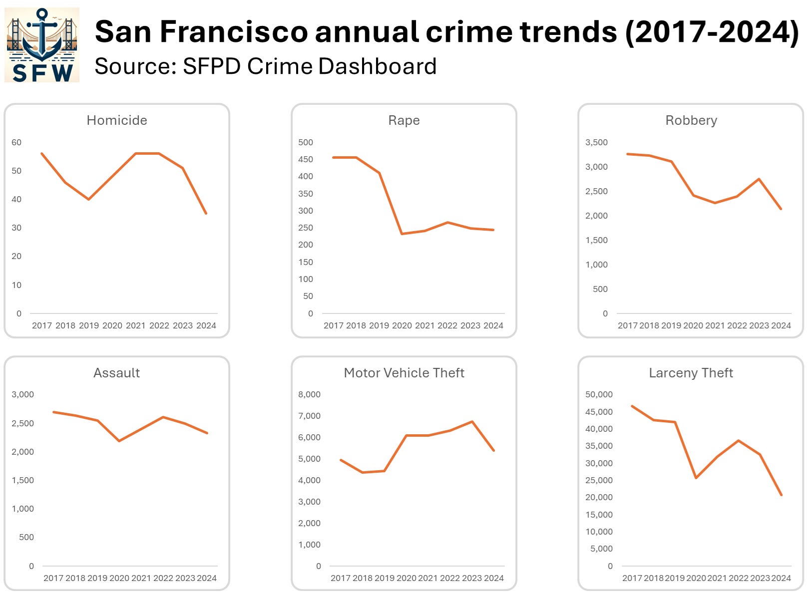 6:46: In 2024, San Francisco homicides hit a historic low, and most major crime categories saw modest to huge decreases, too. This follows a nationwide trend in most major cities, but perception vs. reality are still in conflict in SF
